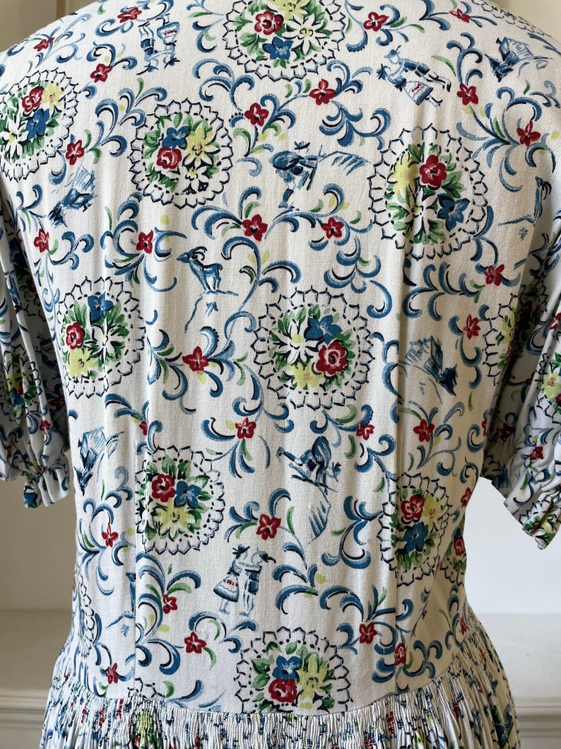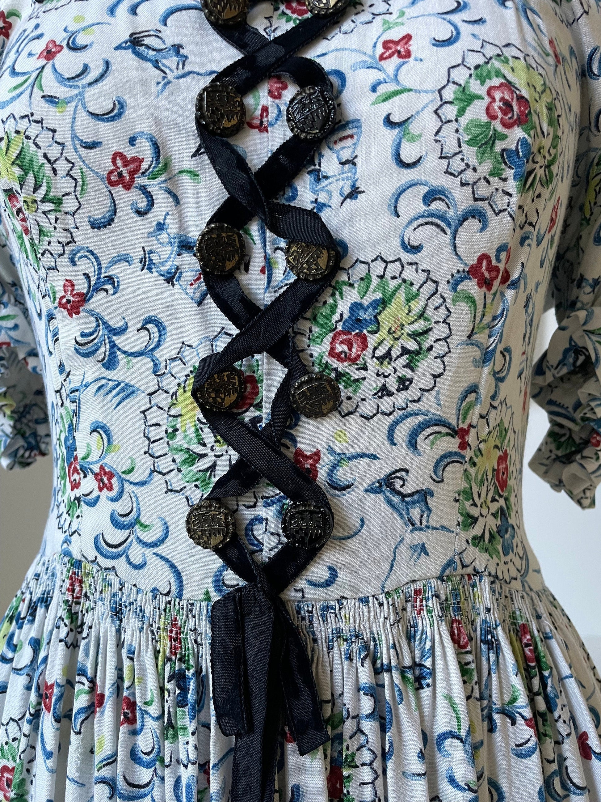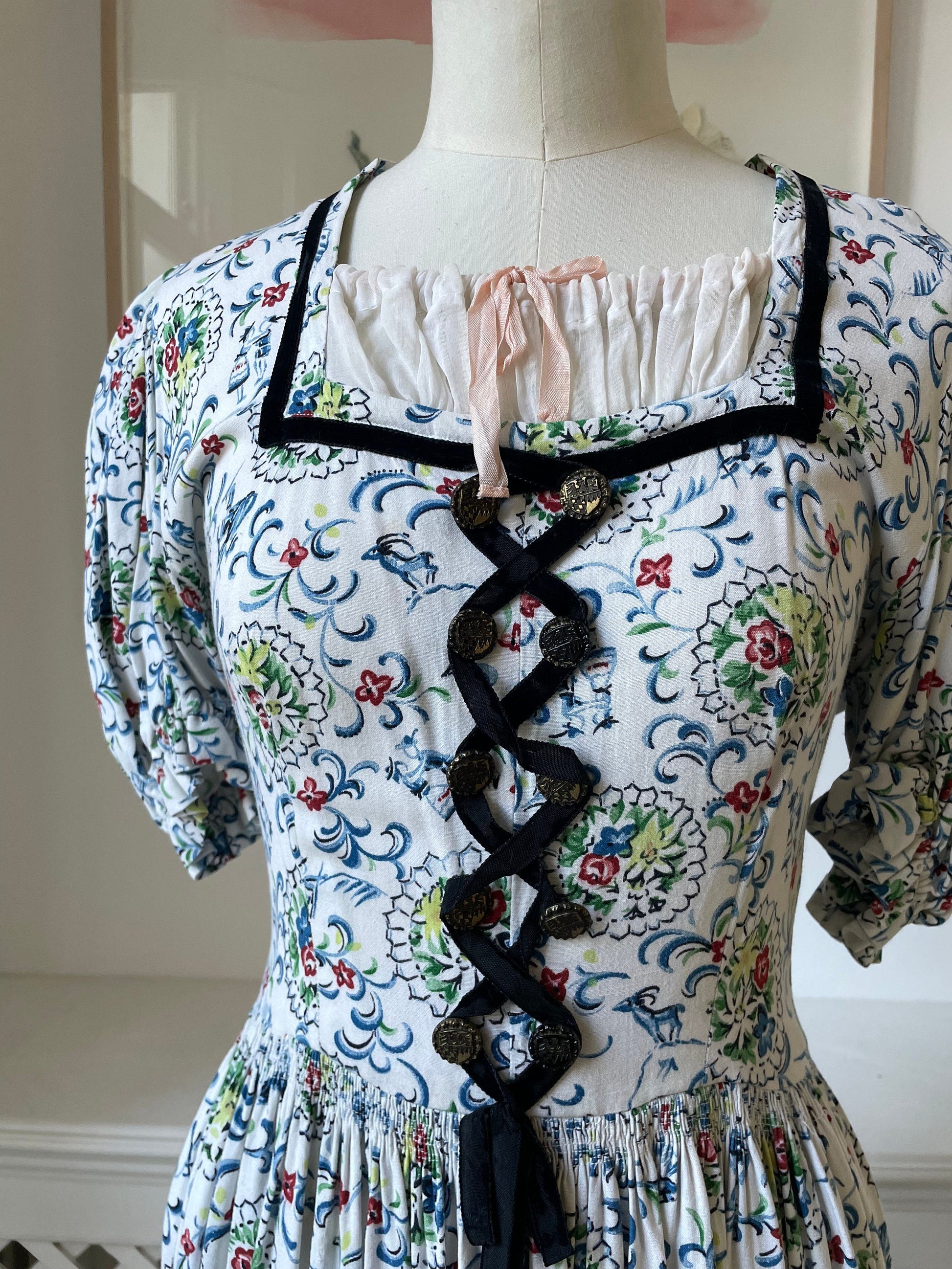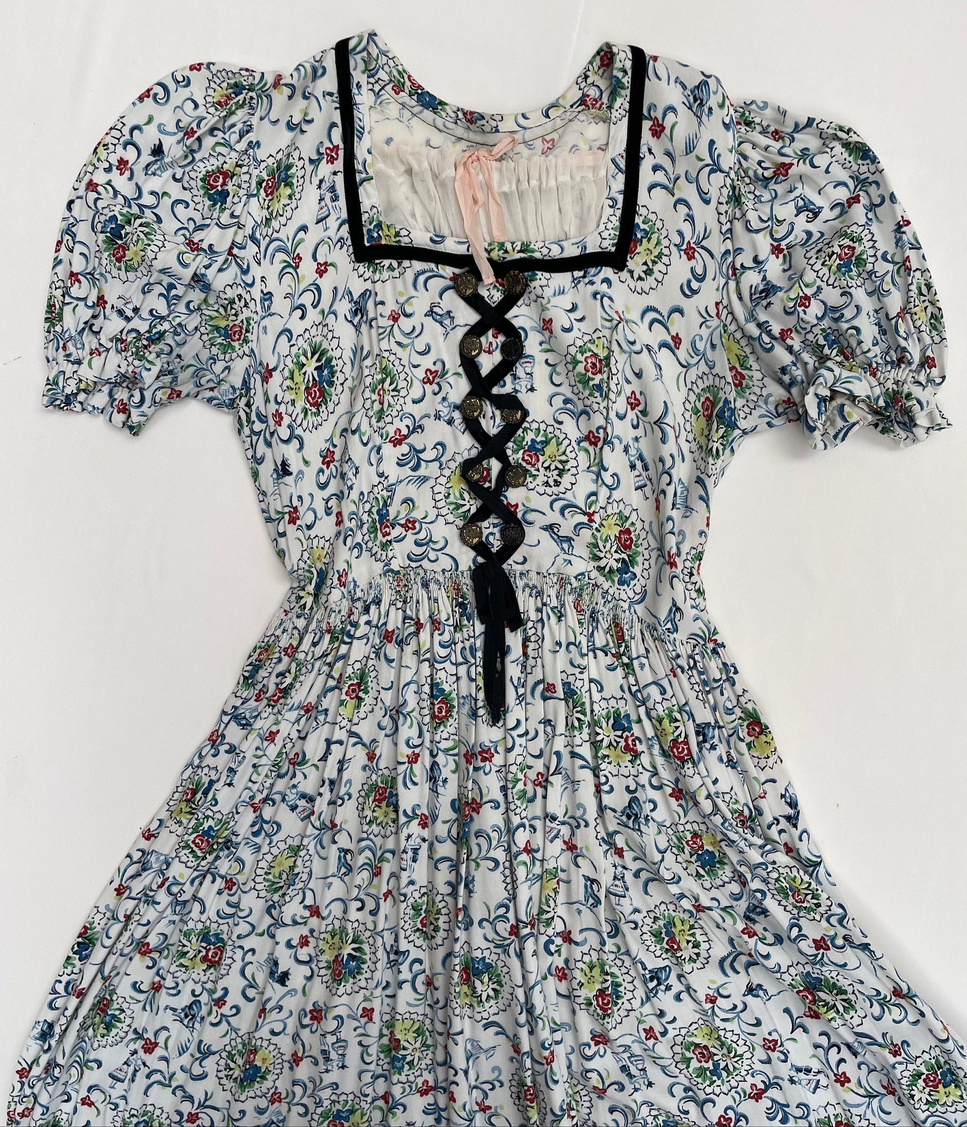 How adorable is this?! This 1940s dress features a charming dirndl design, complete with faux lacing at the front, a semi-sheer tulle panel with a cute bow, and a voluminous skirt that adds to its feminine appeal. It fastens with a zipper at the side.