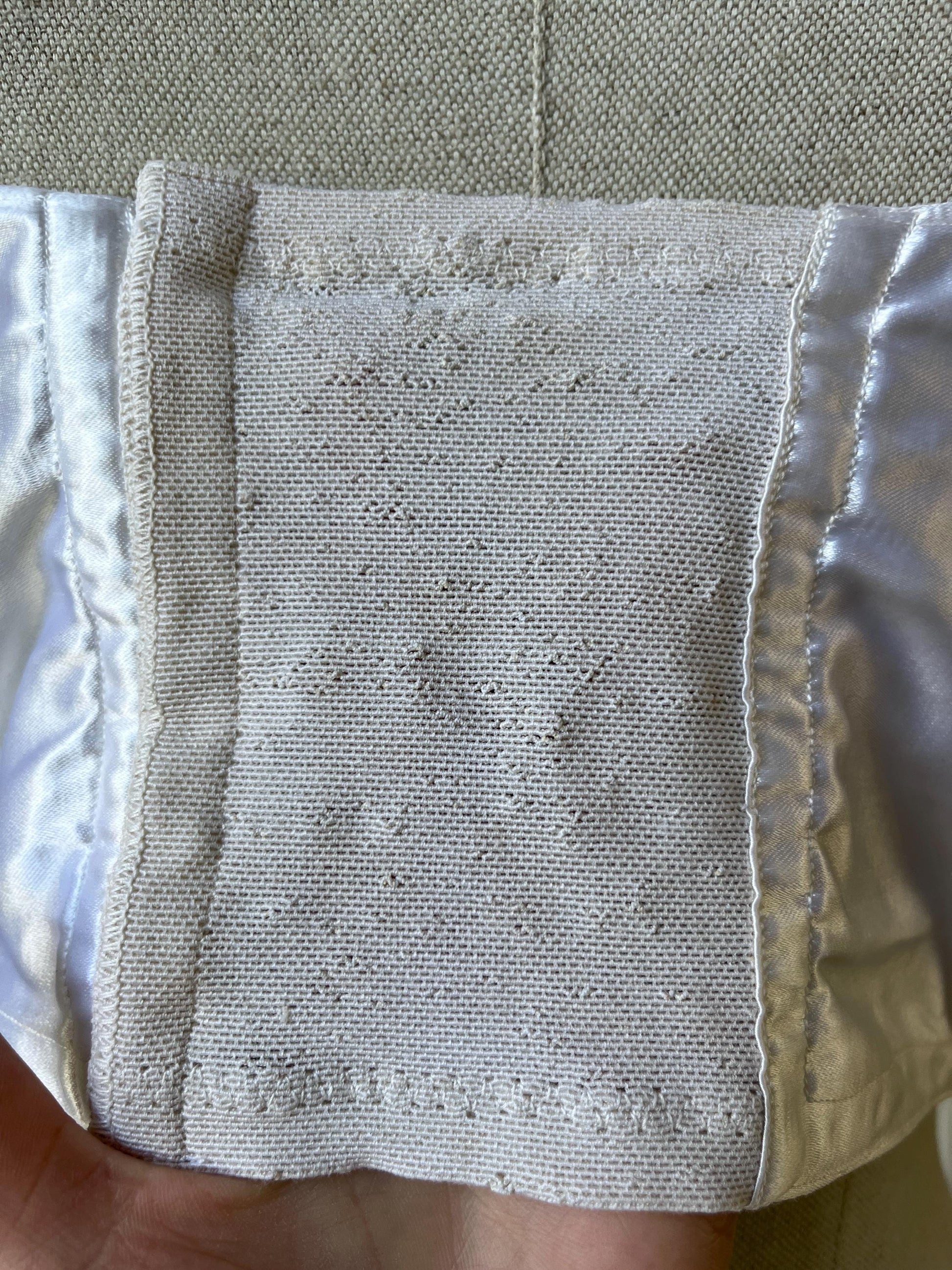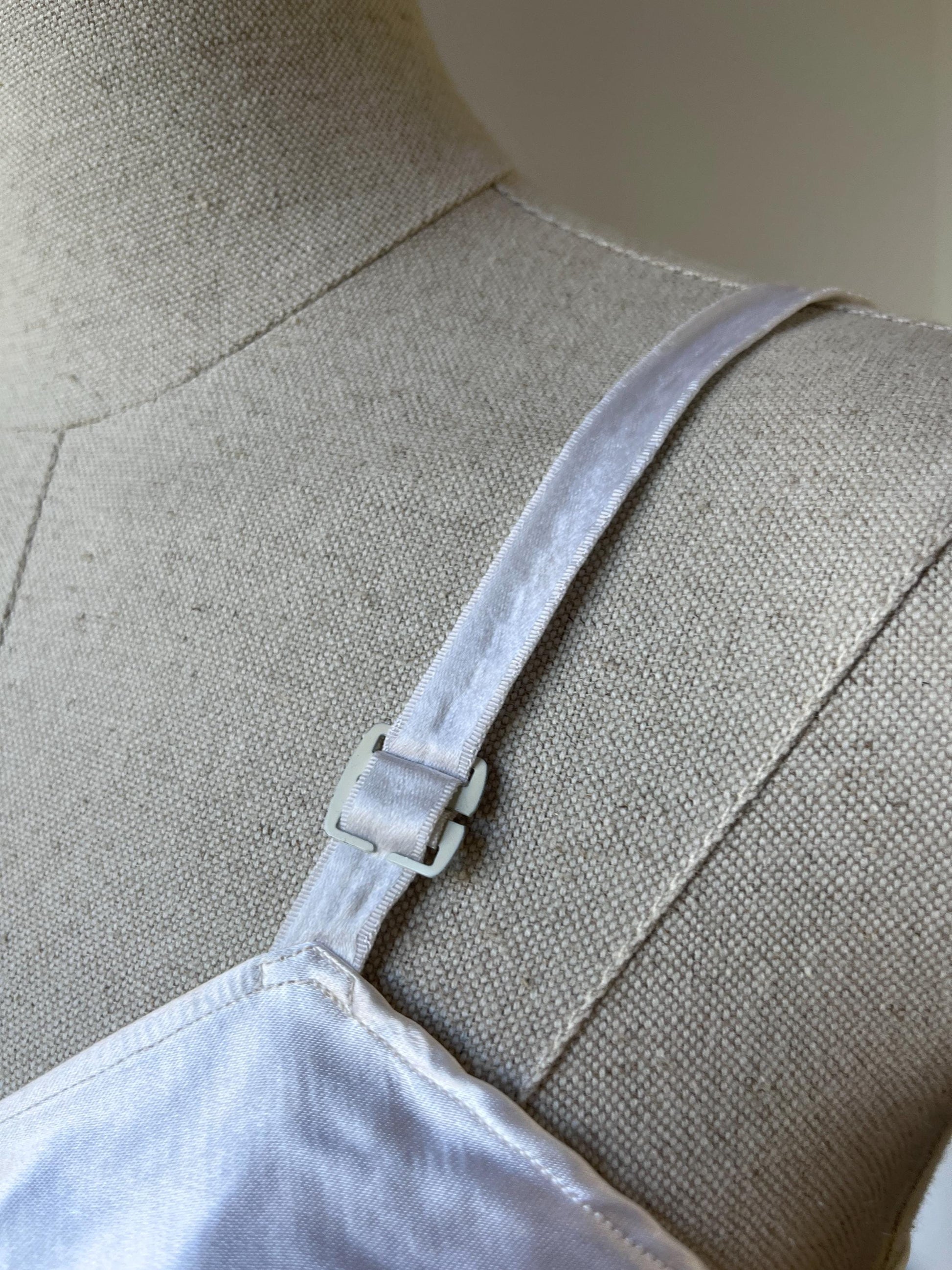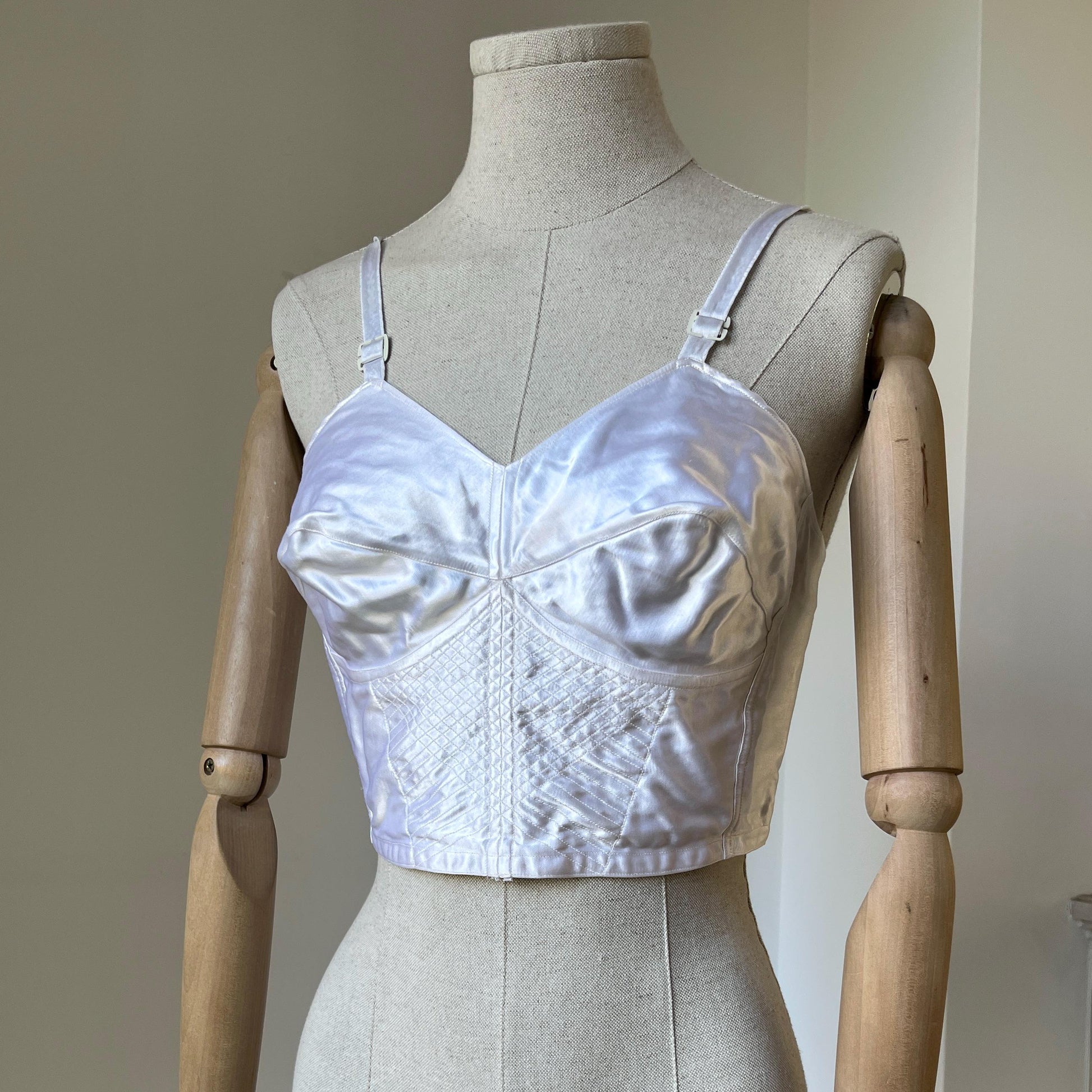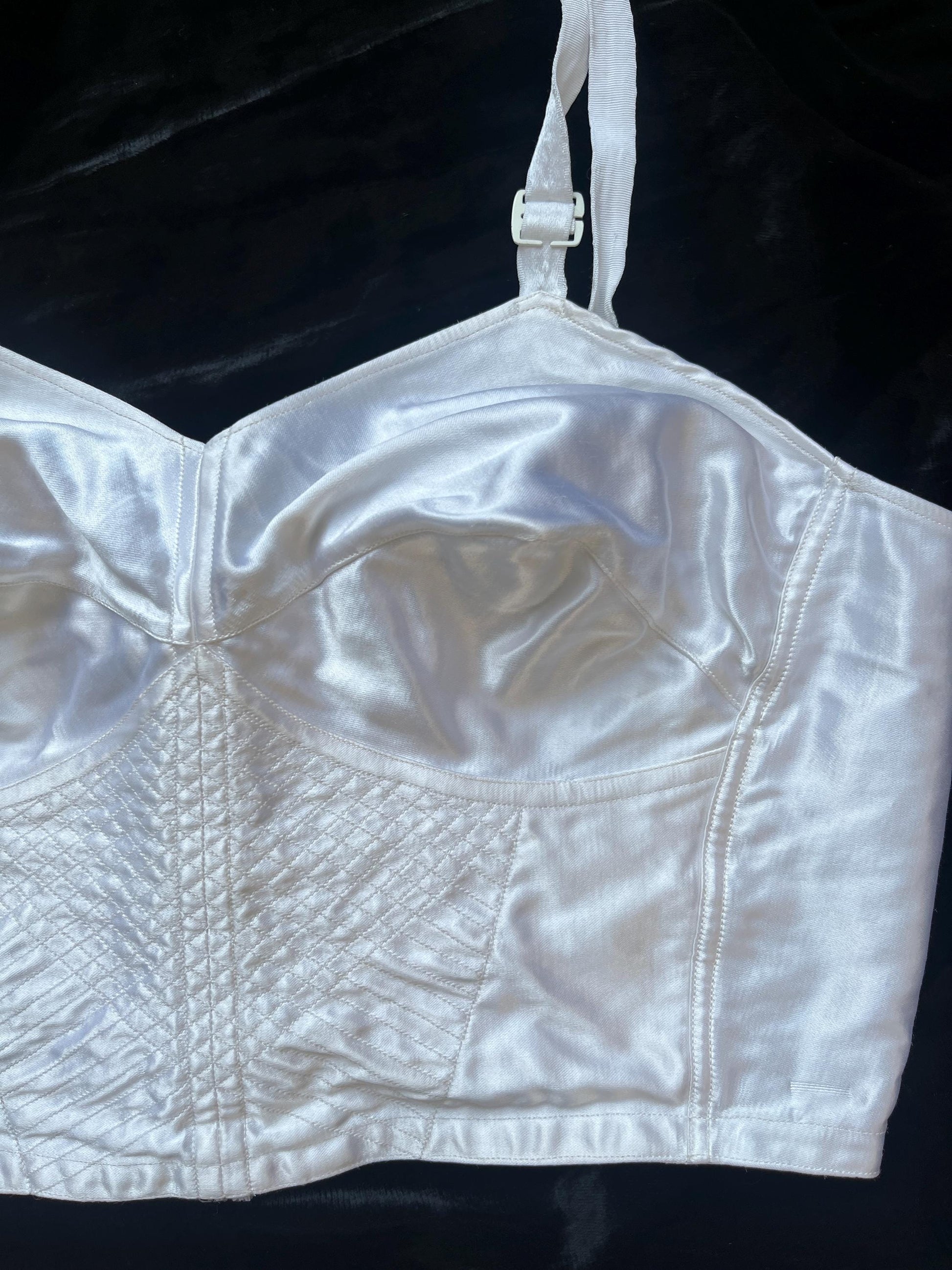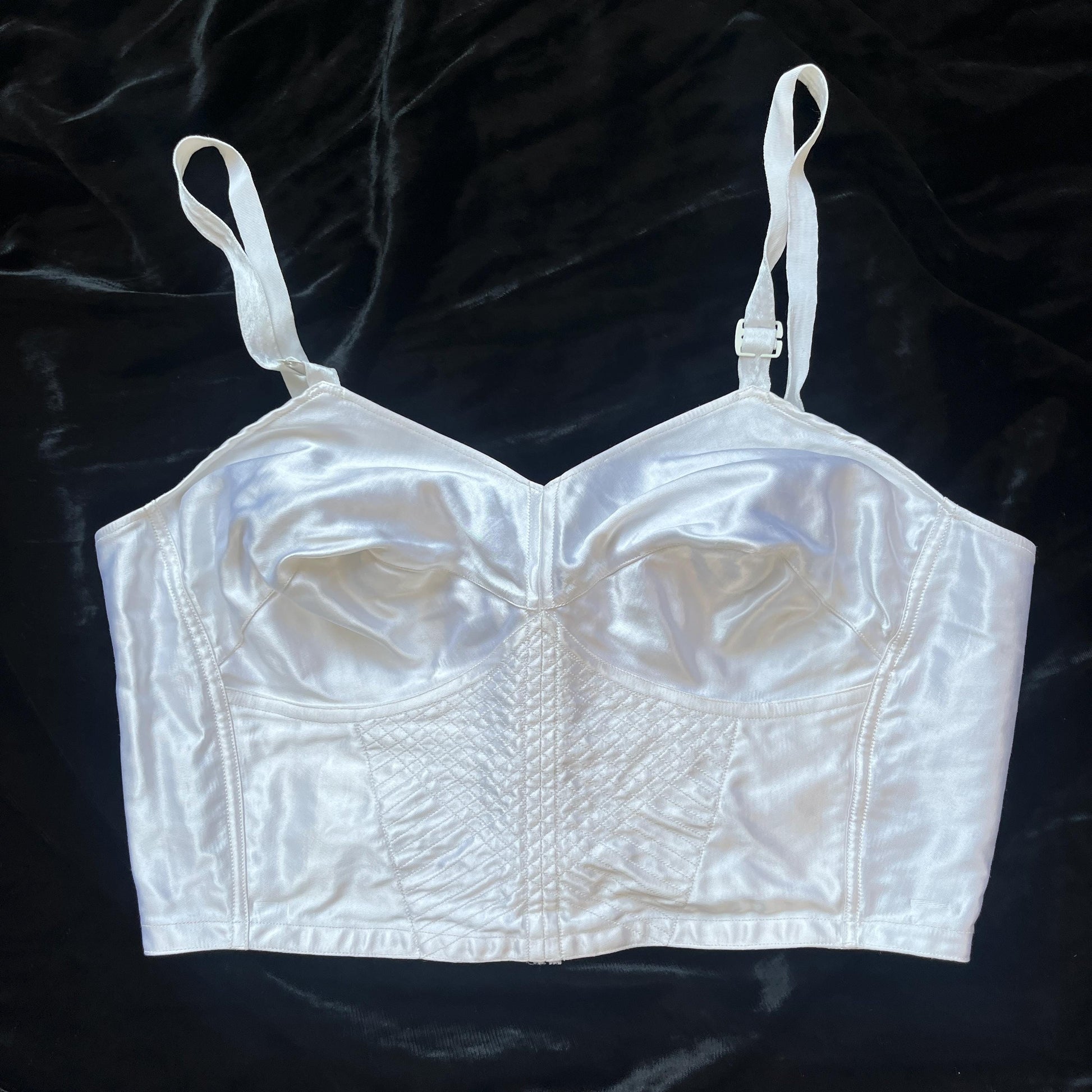 I can never resist a really good bra… This stunning satin number comes from 'Barbara de Paris' and dates from the mid to late 1950s. A classic longline bralette style, it features a panelled front, a hook-and-eye back, and pointed cups with a strong central seam. A lovely quilted detail at the waist adds extra flair, while the adjustable straps with metal clasps ensure a perfect fit. Crafted from gleaming white satin, this is a truly elegant piece of vintage lingerie.