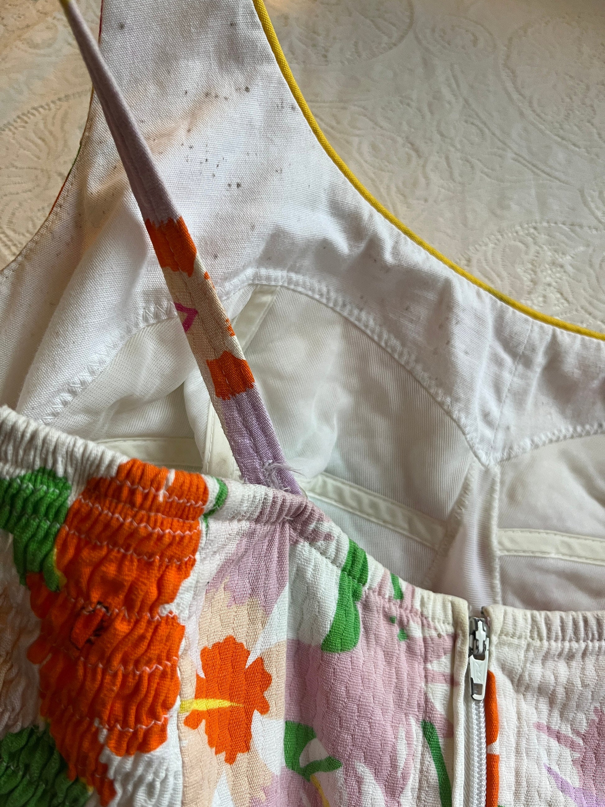 Ahh, the elusive mid-century romper - always a killer find! This lovely piece is from 'Broadway' and has been expertly crafted in Hong Kong. It features a vibrant floral print on cotton, with a wide neck, nipped waist, and charming shorts. Complete with a built-in bra and synthetic lining for added comfort. The shirring at the sides, along with a sweet matching belt, accentuates the waist beautifully. The adjustable, buttoned straps and zip with popper closure at the back ensure a perfect fit. Absolutely fabulous! Please note, this is a beachwear playsuit and not suitable for swimming.