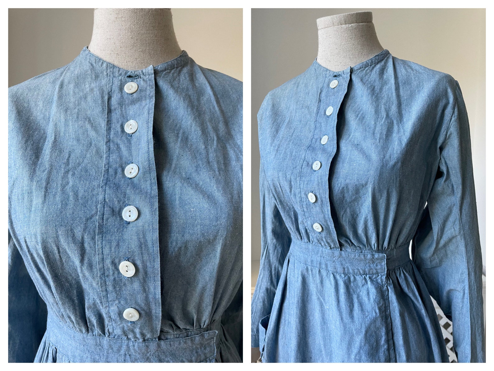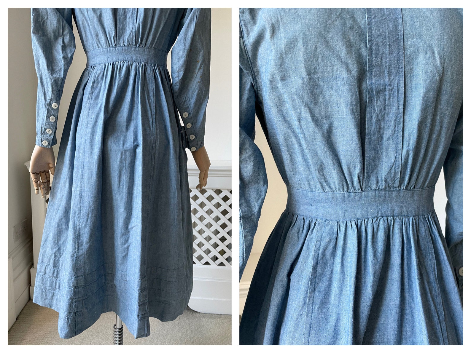 It is made from a lightweight chambray fabric, designed to be worn with an apron, pin-on collar and cuffs, and a nurse’s hat. The dress features a press stud and buttonhole fastening at the back of the neck, a button-through front to the waist, and a hook & eye at the waistband. The sleeves taper to 4 buttons at the cuffs, while the skirt includes a single turn-over style pocket and a tiered hemline.