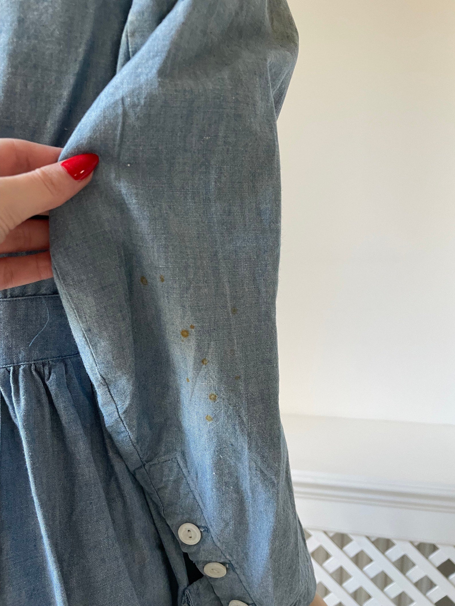 Condition: In good condition. The majority of the dress is in great shape, but there is some fading, small stains, and rust-coloured specks on one sleeve (probably blood!).